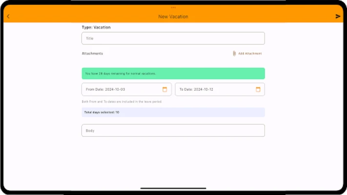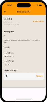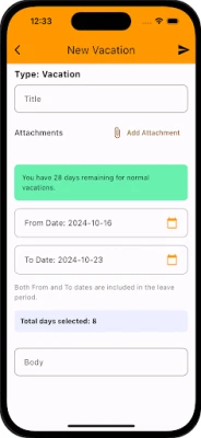 Key Features: • Submit Early Leave, Late Arrival, Partial Day Leave, and Vacation requests. • Track the status of all your approval requests in one place. • Attach documents or files to support your requests. • Receive notifications when your requests are approved or denied. • Easy-to-use interface with clear options for request submission and management.