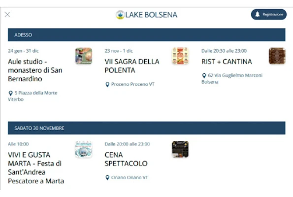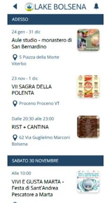Lake Bolsena is a very user-friendly App which will take the visitors to discover history , beau;es and products of the Bolsena’s lake and the area of Tuscia. Users will get descrip;ve informa;on, thanks to the help of videos and pictures, about places of historical and cultural interest, shops, accommoda;on facili;es, restaurants and events. Users will be guided to appreciate our hospitality, in an easy and effec;ve manner, thoughtless and relaxed, thanks to the geoloca;on that will allow to iden;fy and reach all places, maning the most of your stay.