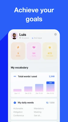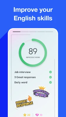 * Track your learning trends to top your daily English fluency score. Perfect your pronunciation and accent by beating your weekly goals.